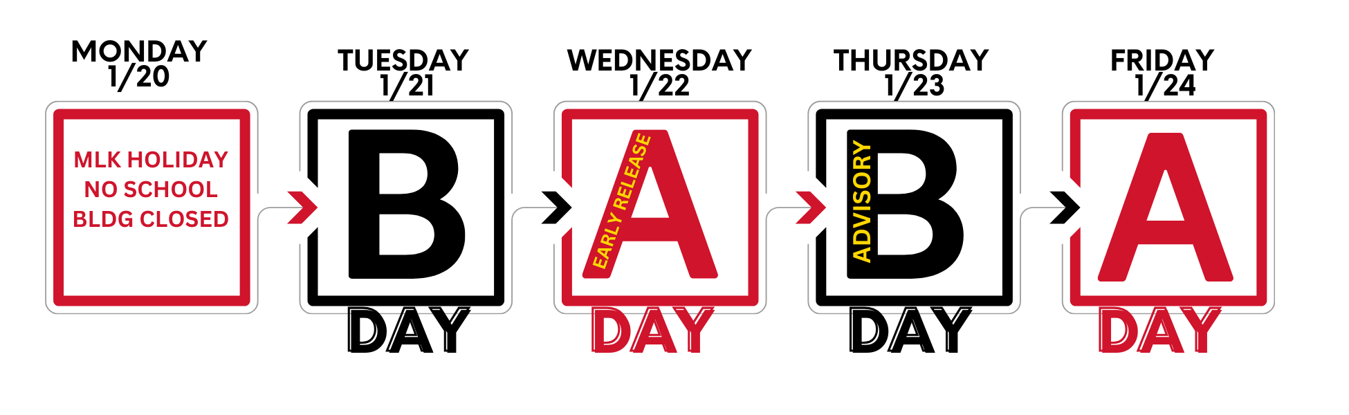 | Monday, January 20 | MLK Day Holiday - No School | |