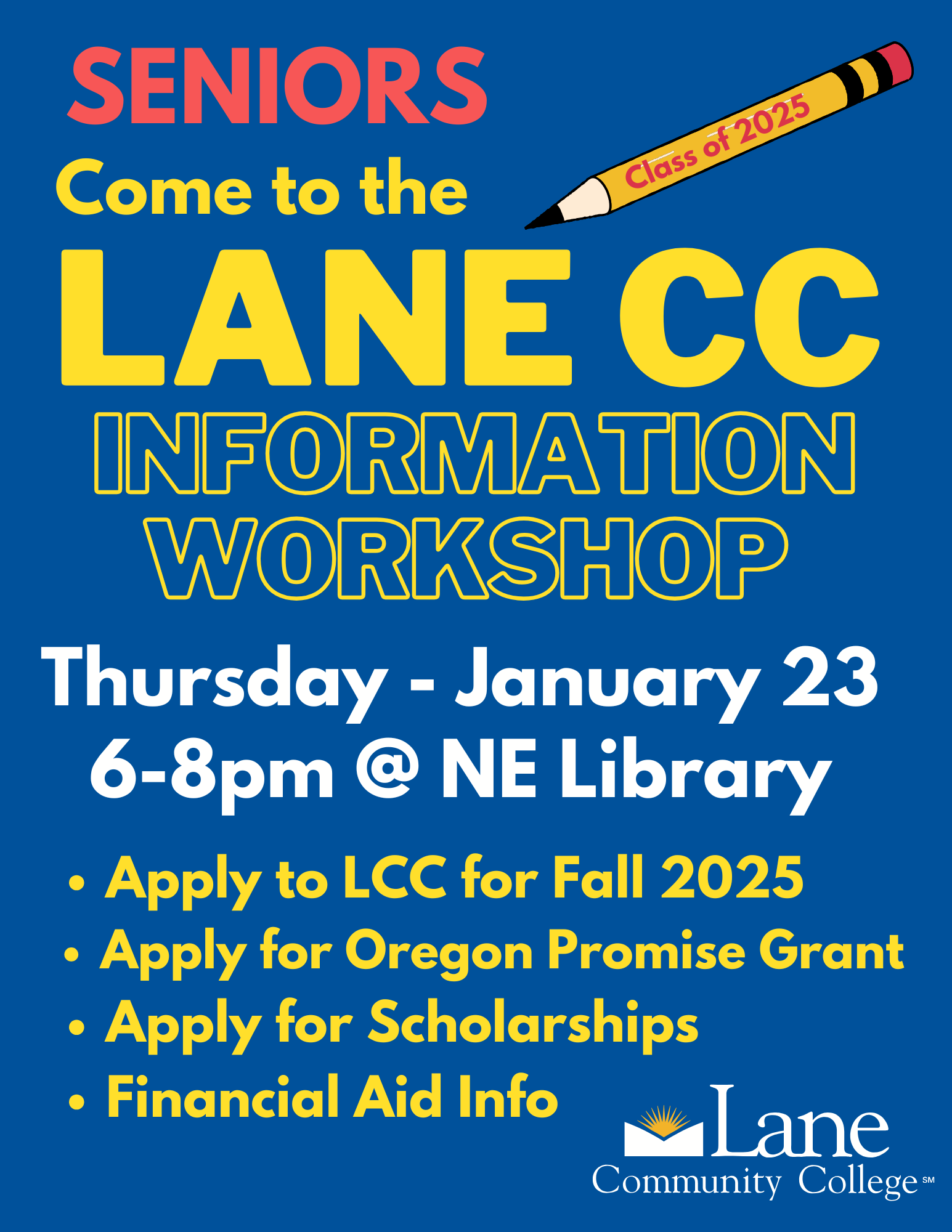 North Eugene High School's College and Career Center invites you to the Lane Community College Information Night and Application Workshop on Thursday, January 23rd, at 6pm.