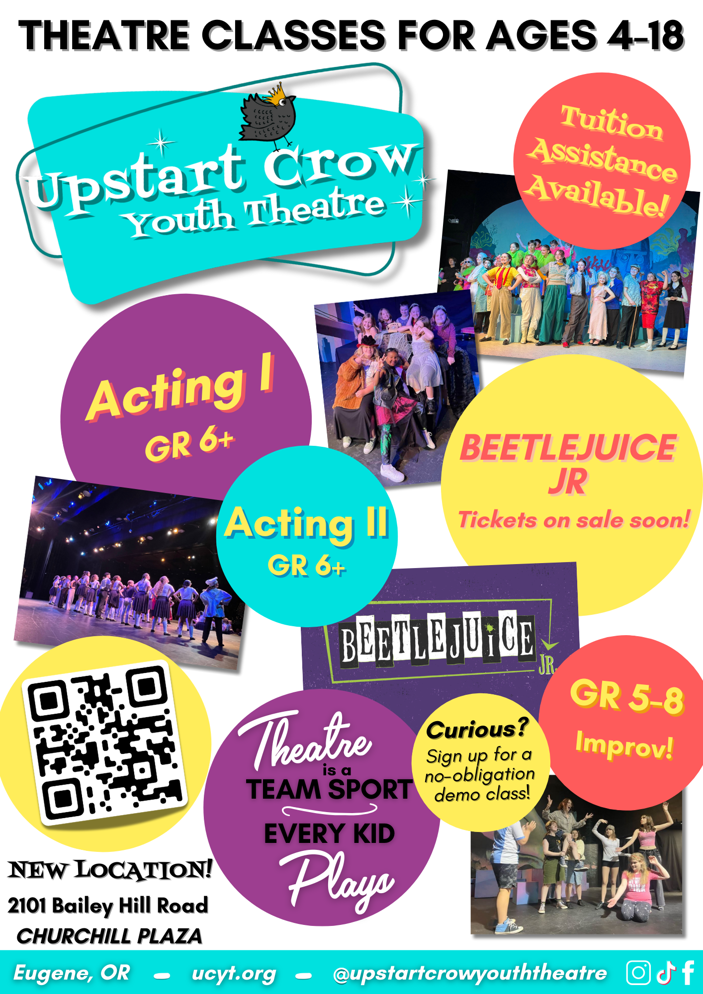 Upstart Crow Youth Theatre (UCYT) is a busy, creative hub for kids and teens *newly located* at 2101 Bailey Hill Road in Eugene. Our program offers theatre classes, summer camps, and inclusive casting in our fully produced and staged musical theatre productions!