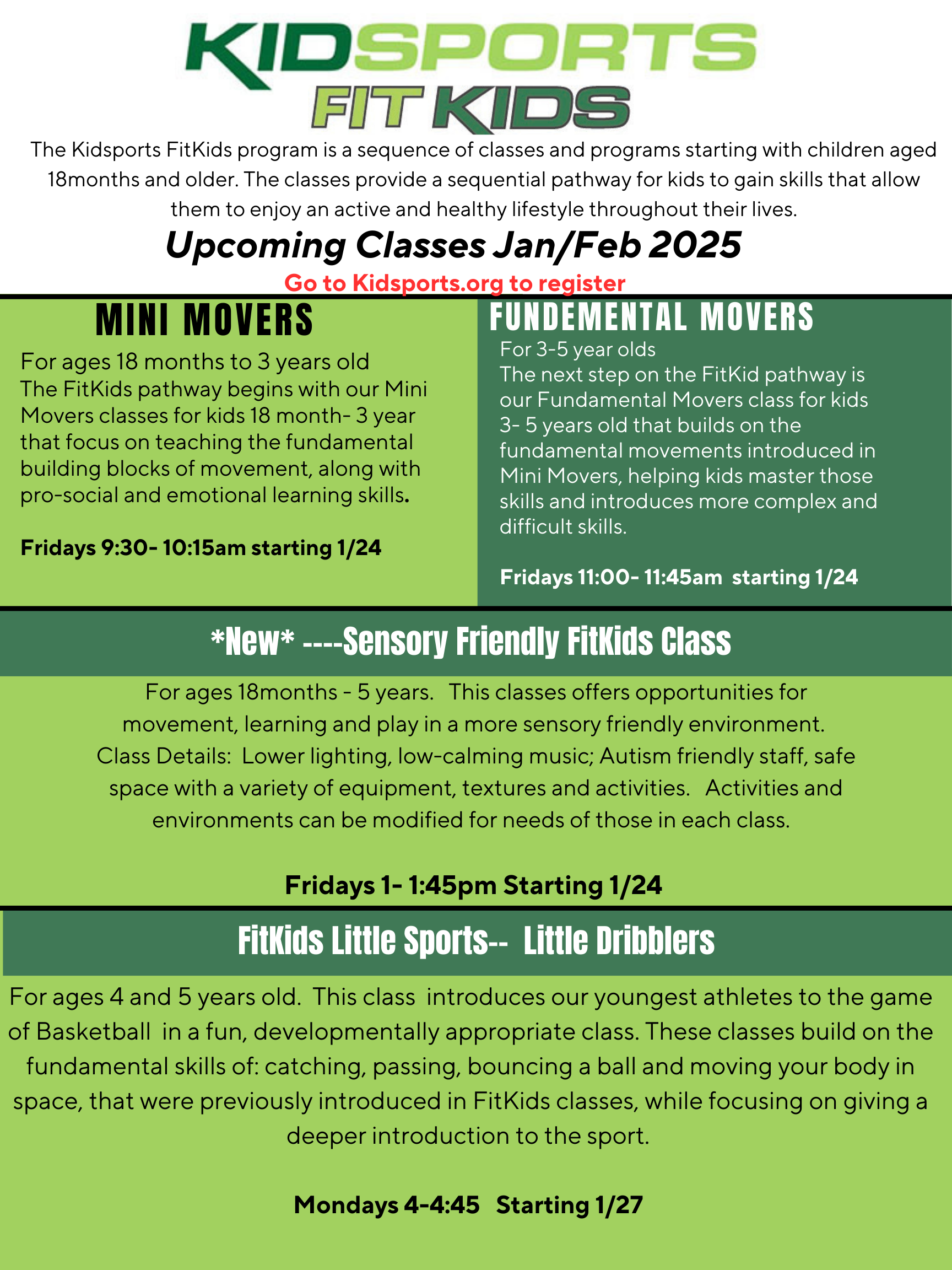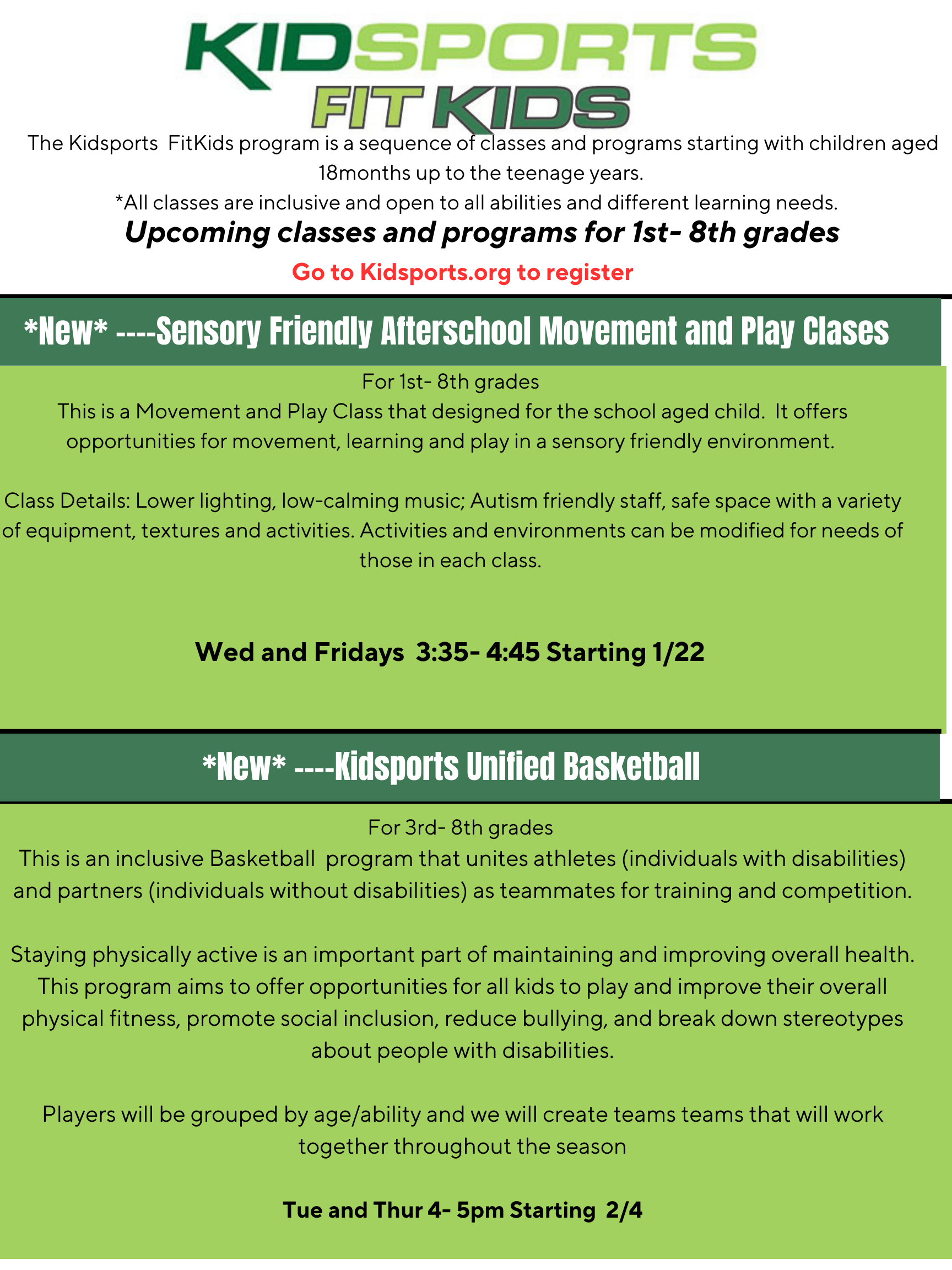 These are programs for kids who might not be interested or are not ready to enroll in our team sports, but are looking for fun and engaging ways to play and be active. I am hoping you can offer this information to your families.
