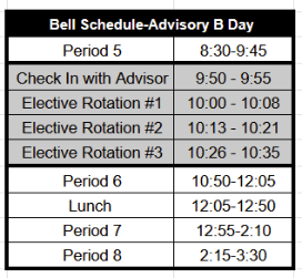 - Students will check in with their advisory teachers briefly (5 minutes). During this check-in advisory teachers will remind students of the schedule and to check the handout for the electives they want to visit during each rotation Seniors will be attending a senior meeting in the auditorium while the advisory fair is going on.