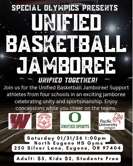 Join us for an exciting Special Olympics Unified Basketball Jamboree celebrating inclusion, teamwork, and sportsmanship! Come cheer on athletes from four schools (North Eugene High School, University of Oregon, Pacific University, and Willamette High School), enjoy great games, and grab some concessions while supporting Unified Sports.